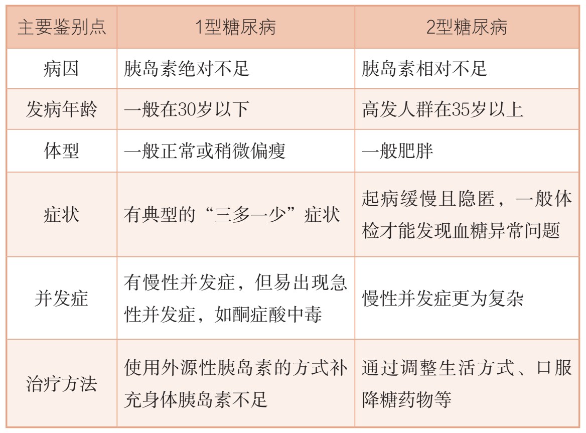 答:1型和2型糖尿病的主要鉴别点详见下表。