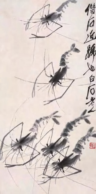 齐白石将青虾长钳造型的美和白虾躯体透明的美以“接木移花手段”(白石印文)融合一体,创构出“白石虾”。虾灵动而呈半透明质感,疏密有致,浓淡相宜,情态各异,惹人喜爱。