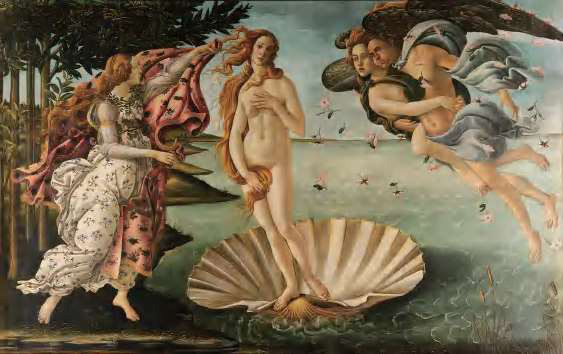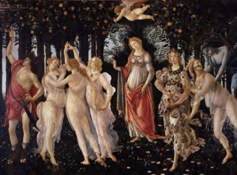 波提切利的代表作,这幅画作空前展示女性胴体,在他之前从没有出现过这样的女体。三美神中,“纯洁”和“爱欲”对抗,“纯洁”的左肩衣服脱落下半截,暗示了爱的诱惑。作者在这里表现了爱的觉醒与美的追求,展示了基本的人性。