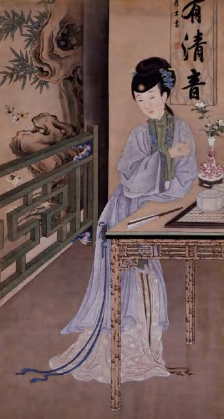 故宫博物院收藏有一套《胤禛十二美人图》,绢本设色,一幅一像。里面出现书架、书案、书籍、字画的频率非常高。