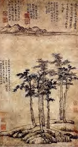 作者用淡逸疏朗的笔墨意趣突出表现了六株挺拔的树木,这六株树分别为松、柏、樟、槐、楠、榆。作者虽然画的是植物,但这六株植物却象征着六君子,体现了倪瓒对君子人格的无限向往。