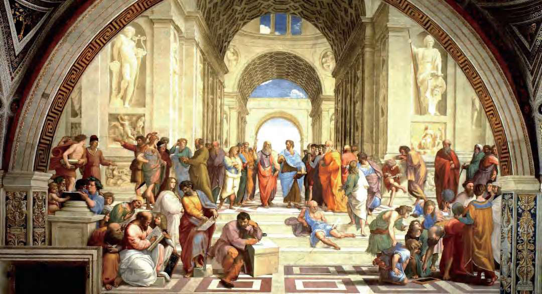 文艺复兴三杰之一的拉斐尔·桑西在梵蒂冈博物馆的壁画《雅典学院》展现了古希腊的人文盛况。