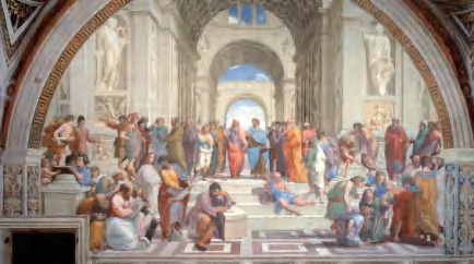 众多古希腊哲学家出现在《雅典学院》的画作中,柏拉图手指天空,暗示着柏拉图式的理想主义哲学,一切存在的东西都源于理念构成的理想国;亚里士多德掌心朝下,暗示着实际主义哲学,那个象征着感性经验、科学验证和广义逻辑通洽的现实世界。对现实与理想的描摹也构成众多艺术家毕生的追求。