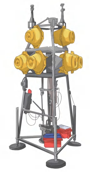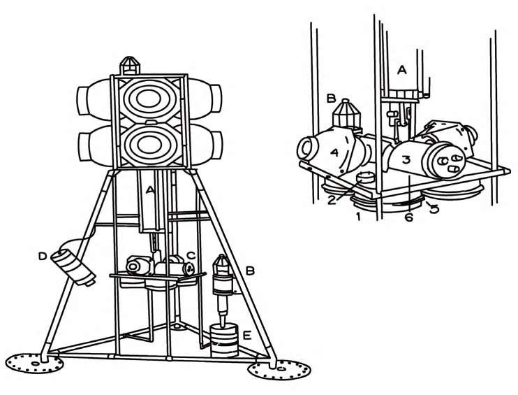 第一台深海着陆器是美国伍兹霍尔海洋研究所研制的FVR系列深海着陆器,最大作业深度5 200 m,高3.4 m,最大底边长2.2 m,可连续工作1~5 d。美国斯克利普斯研究所在此基础上研制了FVGR-1和FVGR-2等一系列深海着陆器,其结构如图1-12所示。
