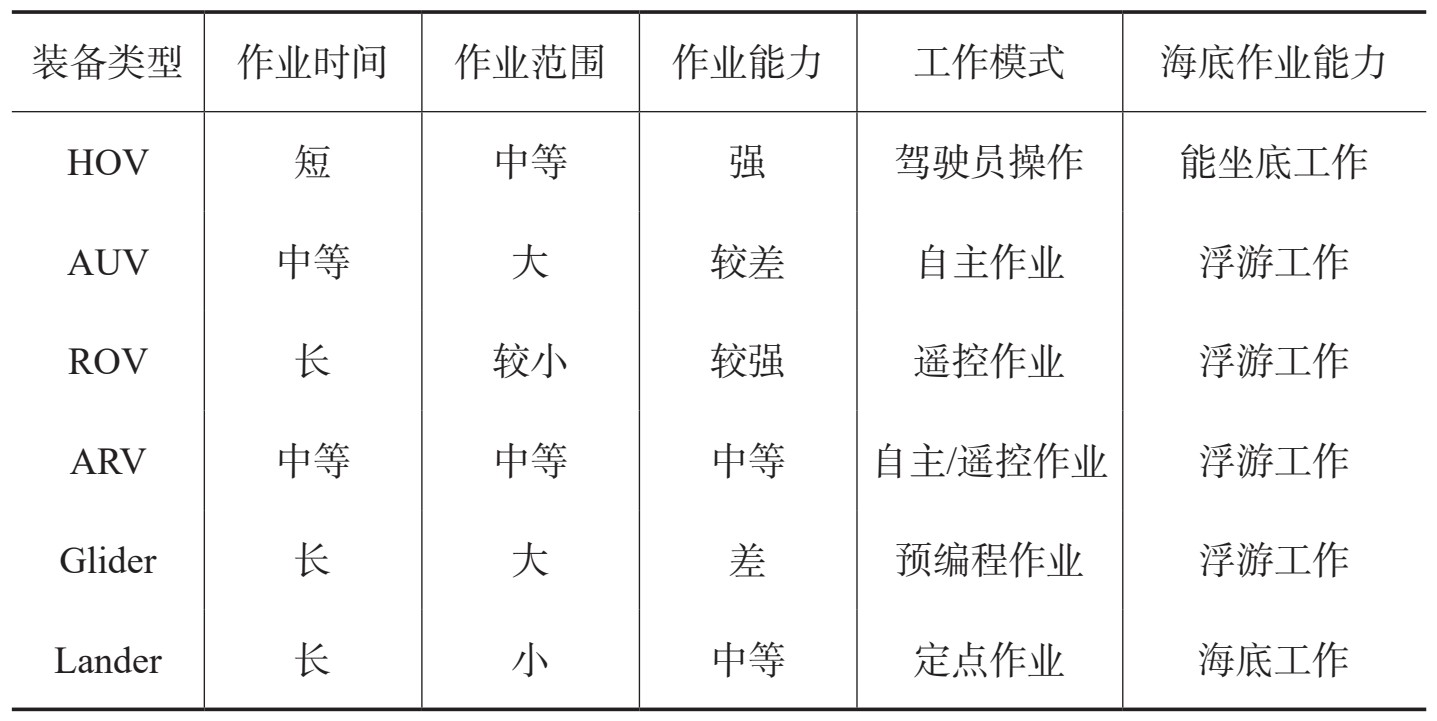 综合以上分析,现有的海洋探测装备多为在水体中移动探测或坐底后采用“蛙跳式”等方式作业,Lander仅能在海底进行定点式的长期探测,无法完成移动作业的任务,而具有较强作业能力的ROV却受光电复合缆长度的限制,不具有进行较大范围移动的能力。表1-1为现有主要海洋探测装备的作业模式特点。