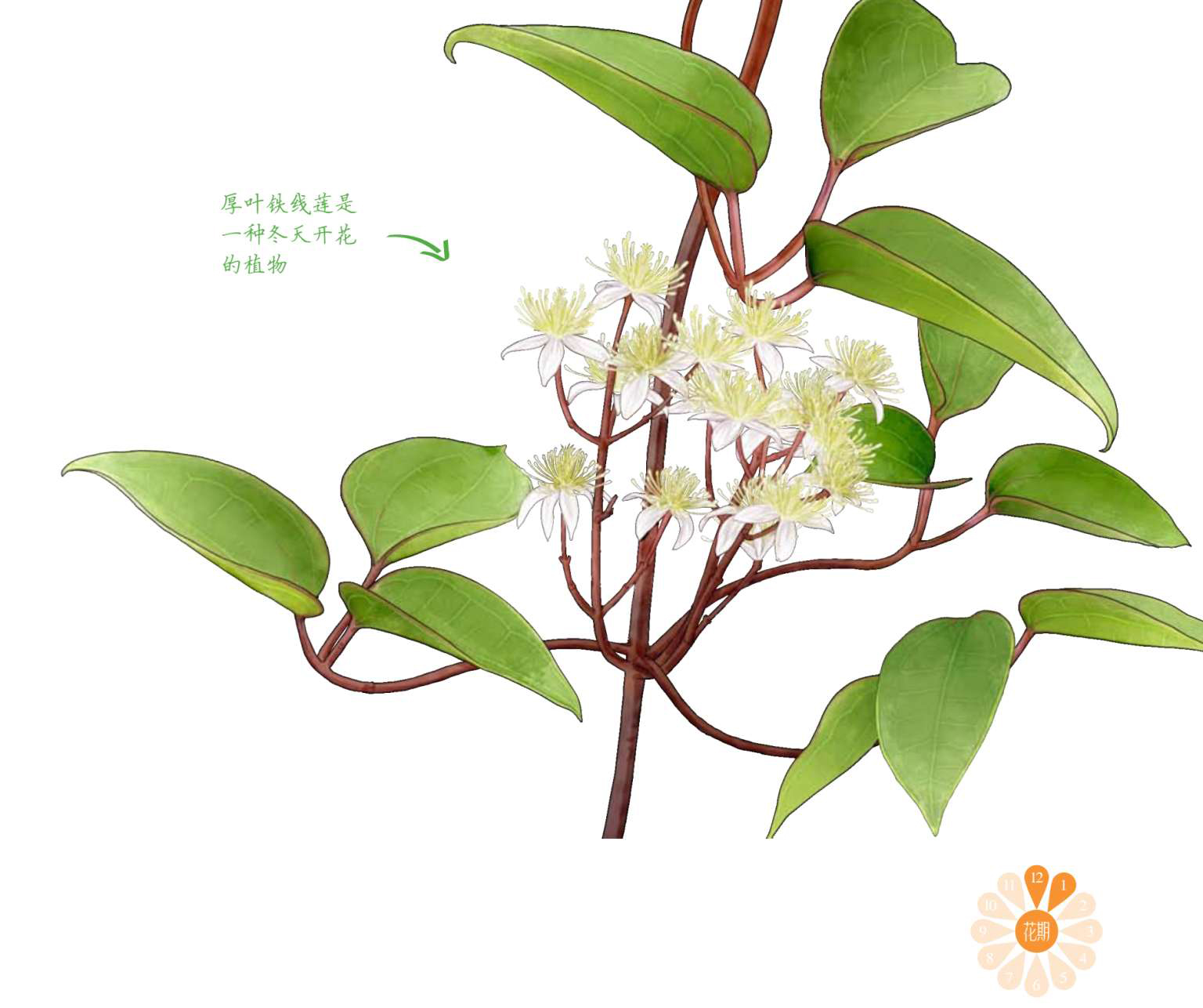 铁线莲家族在园艺植物界可谓大名鼎鼎,铁线莲本种被赋予“藤蔓皇后”的美称,一个世纪前,植物猎人们就将原产于我国的铁线莲属植物带回欧洲并杂交繁育,培育出诸多花色丰富的铁线莲园艺品种。铁线莲属植物多为木质或草质藤本,部分为灌木和草本,其属名“ Clematis ”源于希腊语,意即藤蔓攀援的植物。其茎细且硬,老茎呈棕色或紫红色,看起来像细铁丝,因此中文名被译为铁线莲。厚叶铁线莲同样拥有这样的特征,作为原生种,厚叶铁线莲的花色并不出众,不过这并不妨碍它在南方冬日的暖阳里尽情绽放。 TmhBIP5MIozXasHnbDCyG0cIN3Wsq6EwBbDCcsZusl+ulcc/2+JckGgrbLXd7/RS