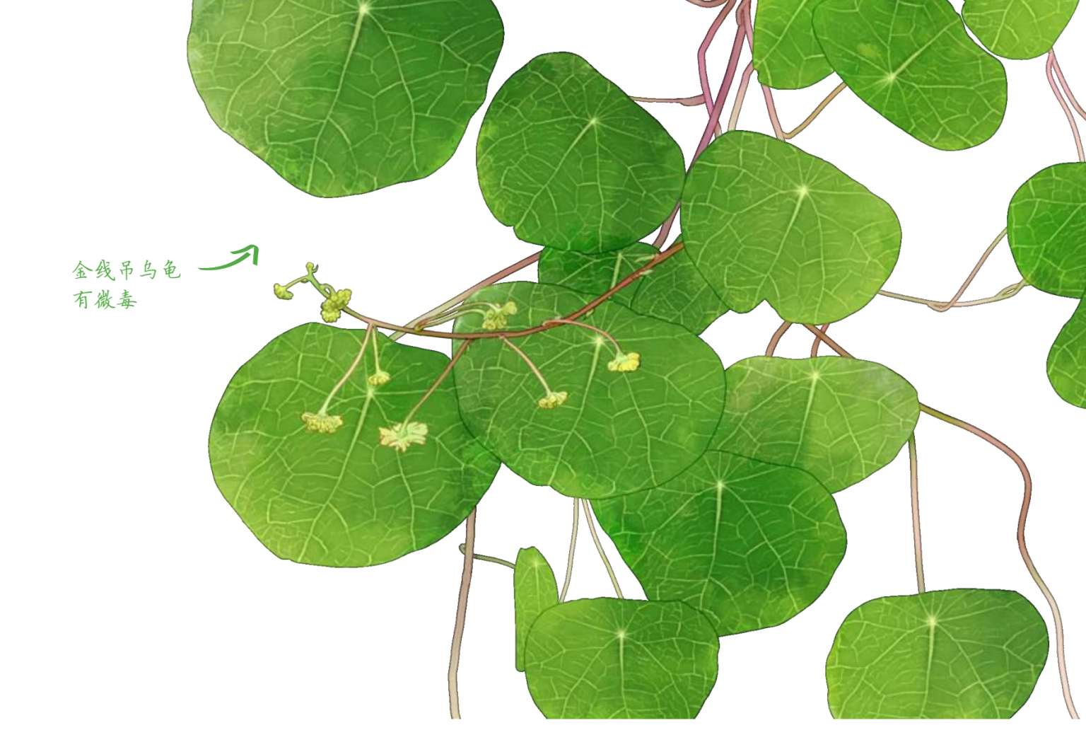 很多人都没有发现,金线吊乌龟纤弱的草质藤本下面,居然藏了这么一个外表粗糙、硕大无比的团块状块根,如同用一根细线钓着一只大大的乌龟。如果植株生在土层深厚的地方,这只“乌龟”就会潜入土下很深的地方;但如果不小心长在了石灰岩地区土壤贫瘠的石砾之中,它又会悄悄地浮露于地表。