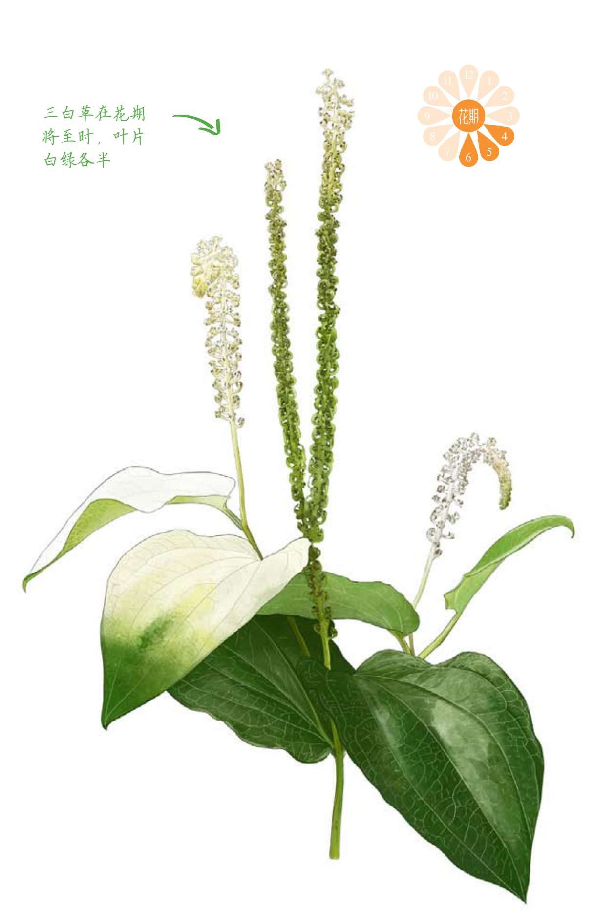 三白草,又称塘边藕,是一种生于水边的湿生草本,高1米有余。因在花期将至时,植株顶端2~3片绿色的叶片会转为白色,或是白绿各半,十分亮眼,因此被命名为“三白草”。本种隶属于一个种类非常少的小类群——三白草科,仅包含4属6种植物,但其足迹却遍布东亚和北美。尽管这个家族成员极少,但有一位鼎鼎大名的成员——蕺菜,即鱼腥草,作为鱼腥草的近亲,三白草也同样具有强烈的腥味,也具有悠久的药用历史。 4XPKTTo76rHstDJrzYMaWNSyeqjSd+CZNHa8XOXABtbXbLHg+EsL7rh+3YTGGSZX