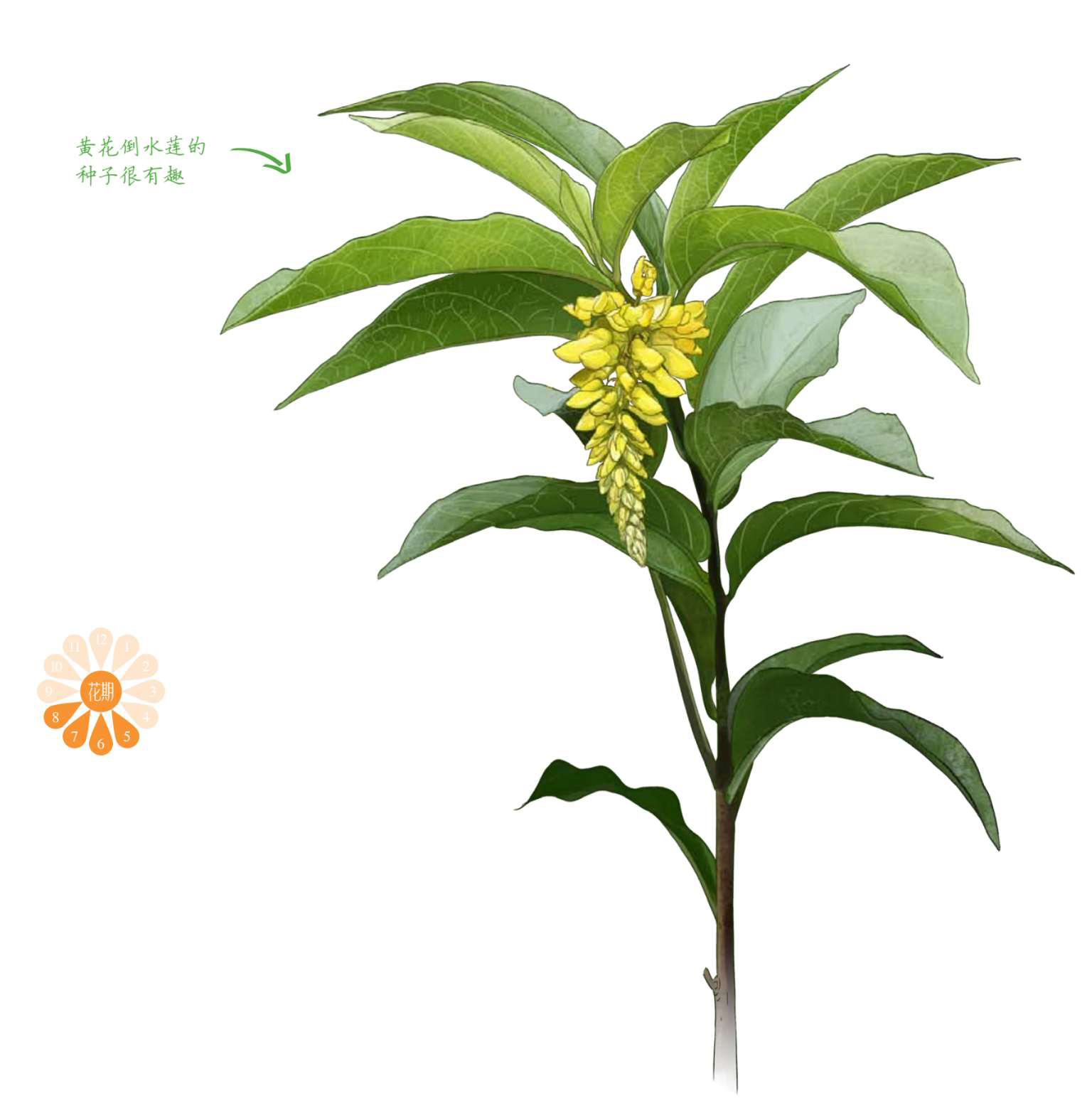 黄花倒水莲的种子棕黑色,圆溜溜的,表面有许多白色的短柔毛。最特别的一点是,其顶端还有一坨像黄油一样半透明的油质体,里面富含蛋白质和油脂,常常会吸引寻找食物的蚂蚁或昆虫把整个种子拖回它们的巢穴。而巢穴内正是适合种子发芽的好环境,这样,黄花倒水莲就实现了传播种子的目的。