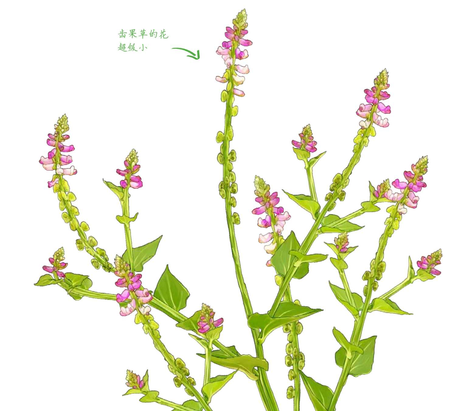 齿果草的花只有2~3毫米,肉眼可见的仅是一些紫花点点。乍看之下,花形很像豆科植物的蝶形花冠,必须得睁大眼睛,才能瞧出些远志科的端倪。萼片5枚,小到看起来几乎一样大。花瓣3枚,中间1枚最大,呈龙骨瓣状。和远志属的8枚雄蕊相比,齿果草属的雄蕊只有4~5枚。