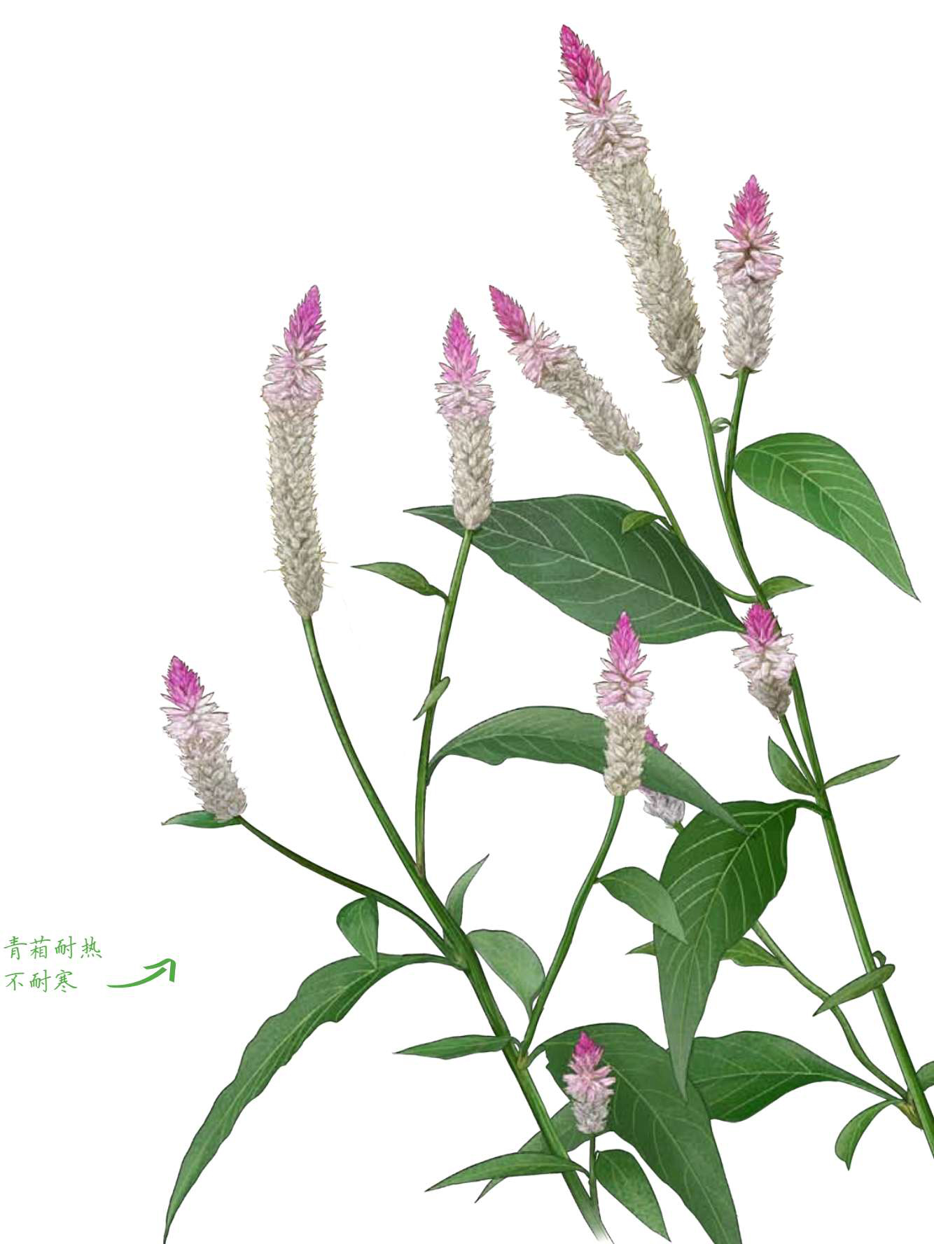南朝陈后主沉迷于音律酒色,曾创作一首词牌《玉树后庭花》,隋军兵临城下时,他还在宫廷中舞奏此曲,南陈就这样随着这首曲子灭亡,而这首《玉树后庭花》也成了亡国之音的代名词。许多人不知道的是,这里的后庭花指的就是青葙。陈后主见后院中的青葙亭亭玉立,以此来赞颂他的众多宠妃们。在为青葙背负上“亡国之花”的蔑称感到不值的同时,我们也能感受到青葙的俊秀。青葙是一年生草本,分布几乎遍布全国,每年秋天来临,那粉色的穗状花序变得愈发修长,秋风掠过,青葙便在风中摇曳起舞,独成一景。另外,园艺中也早就对青葙有应用,常用作节庆日花坛装饰的鸡冠花,即青葙的栽培品种。