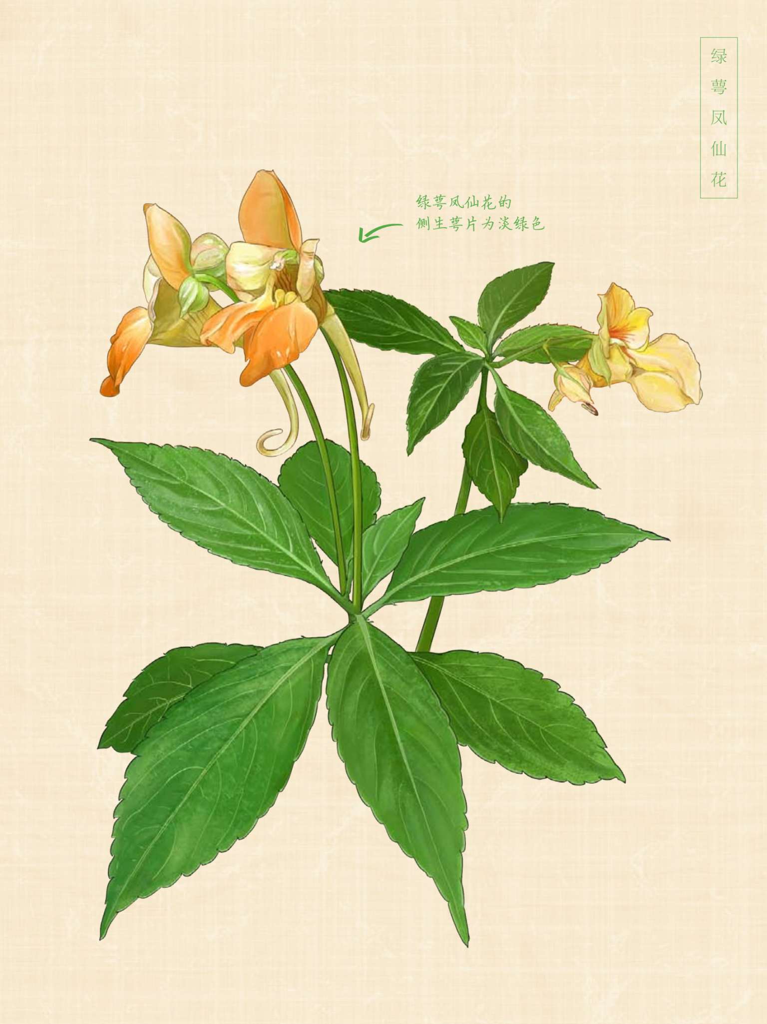 同样,在绿萼凤仙花上也能看到这个现象。它是一年生草本,因为侧生萼片呈现淡绿色而得名绿萼凤仙花。它的花朵淡红色,唇瓣上有红色条纹,距长2~2.5厘米,分布于广东、广西、贵州一带。