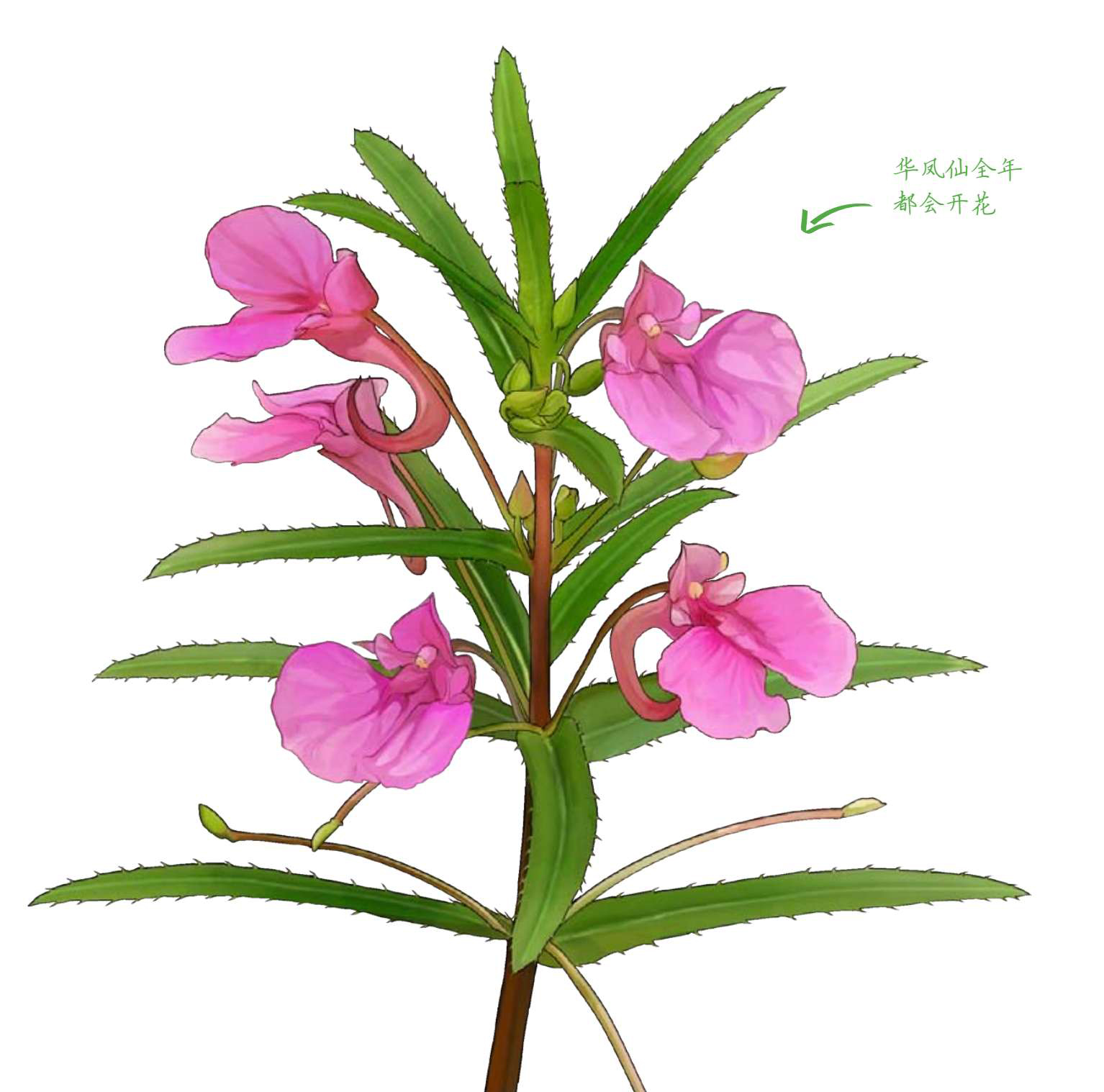 华凤仙是一年生草本植物,高30~60厘米。其种加词 chinensis 即“中国”的意思,因此得名“华凤仙”,不过这也恰好呼应了它那艳丽的粉色花冠。较属内其他成员而言,华凤仙的分布范围算是相对广泛的,在我国南方大部分地区可见。在水、热充足的条件下,华凤仙生长迅速,几乎全年可见开花,常在湿地及稻田边成片生长。盛花期的华凤仙,就像一群群翩翩起舞的蝴蝶在草丛中嬉戏,极为生动有趣。 sgcQXNuKesoNepoOG63SgIhJZ3coJvqLdAZtvu1O5wDwKWm1DfcvSupPDBYOl889