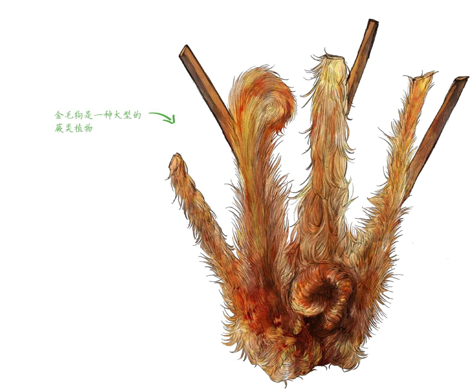 它的根状茎和叶柄基部长满了厚厚的、金黄色的长茸毛,摸上去柔软而富有弹性,就像在摸一只温顺可爱的大金毛狗。