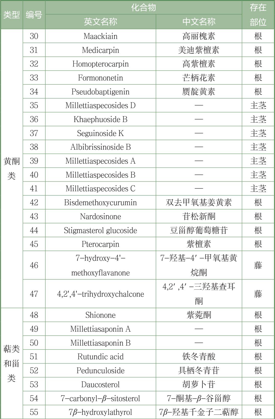 目前,对牛大力化学成分的研究主要以其根部为主。Uchiyama等最早从牛大力75%的乙醇提取物中分离得到2个新的齐墩果烷型三萜皂苷和2个已知的紫檀烷类化合物。
