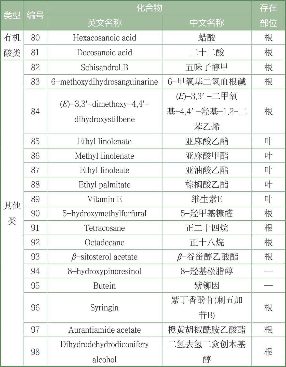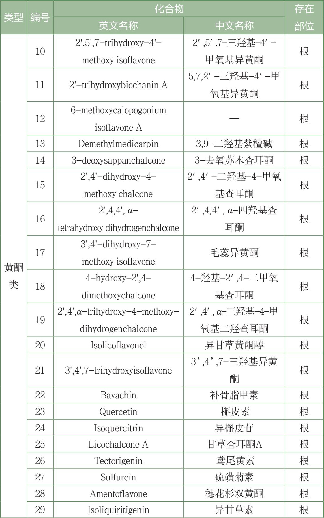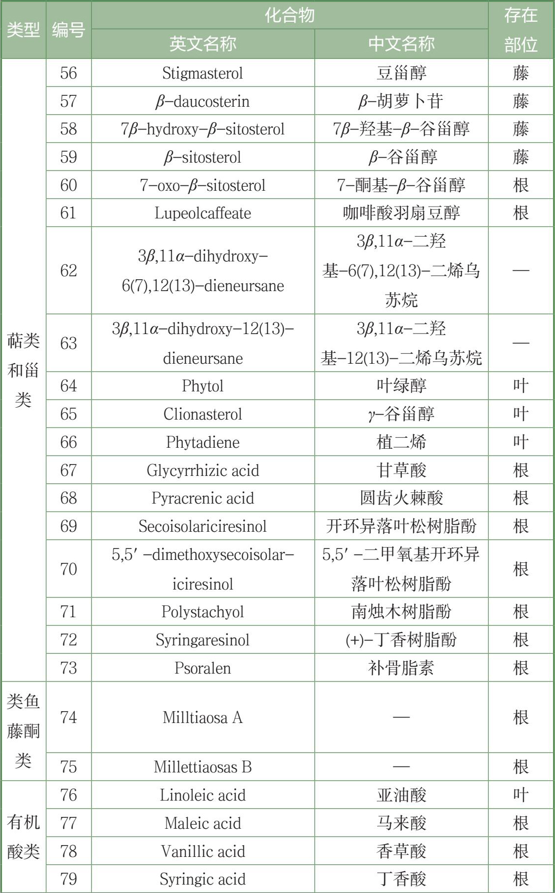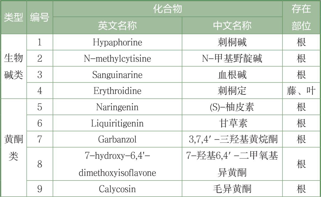除此之外,《中药大辞典》等书中记载牛大力根含有生物碱。据报道,张宏武等首次从牛大力根中分离制备刺桐碱对照品并通过高效液相色谱法建立了刺桐碱含量的测定方法。牛大力的化学成分见表4-1。