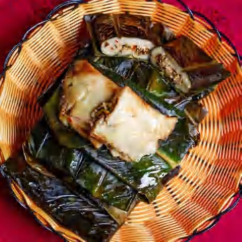 5将粉团分成小块,包入馅料,用芭蕉叶包裹成生坯。