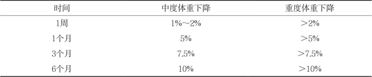 1)体重:体重是机体脂肪组织、瘦组织群、水和矿物质的总和,是评估营养状态最简单、最直接的工具,总体反映人体的营养概况。但体重个体差异性较大,尤其对于伴腹水、腹腔巨大肿瘤、高钠饮食的患者,单纯的体重同时易受到体内水分潴留、骨骼肌或脂肪水平的影响。具体见表7-1。