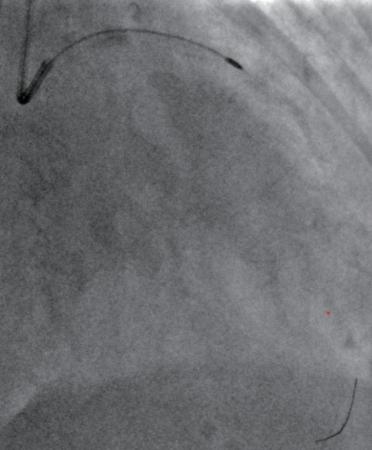 图1-3-2 旋磨头通过冠状动脉狭窄处的造影