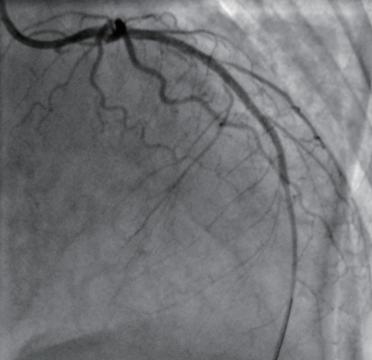 (4)将斑块磨通后选择型号合适的支架覆盖病变部位,再予高压球囊充分扩张支架,如造影显示支架与血管壁贴合紧密(图1-3-3),血管腔内血流通畅,血管壁完好,无造影剂滞留、渗出,冠状动脉各分支完好,患者不适症状减轻或消失,则撤出各导丝及导管,予桡动脉压迫止血器压迫穿刺口,手术结束,护送患者安返病房。
