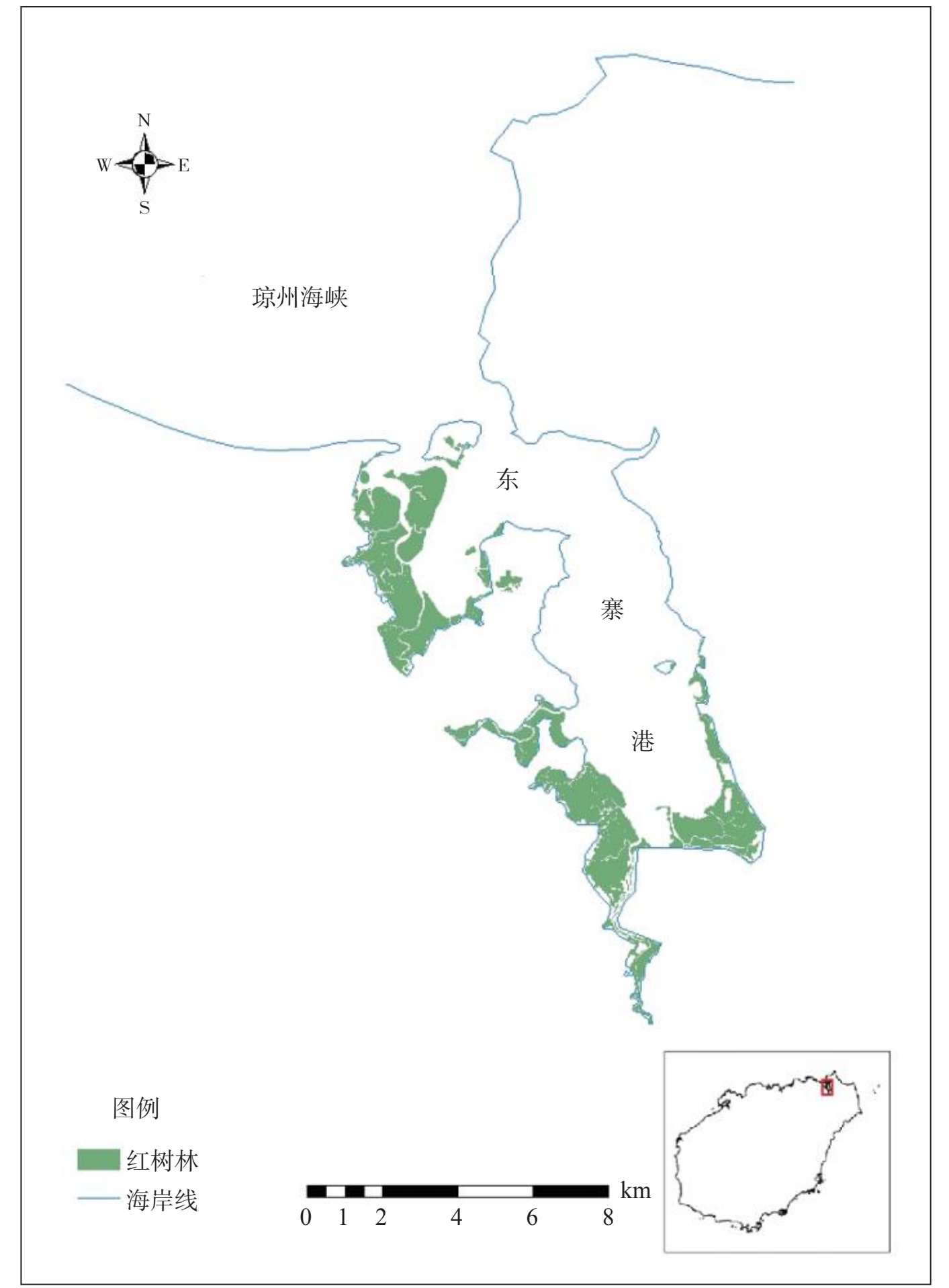 东寨港位于海南省海口市东北角,古称东斋港或东争港,地理坐标为19°52′48″N~20°0′59″N,110°32′7″E~110°38′4″E,北接琼州海峡,西邻海口市演丰镇,东北接文昌市铺前镇和罗豆镇,南接海口市三江镇。东寨港港湾形如漏斗,海岸线曲折多湾,绵延约50km,港湾内滩面平缓,避风条件好,有利于红树林的生长,因此孕育了成片的红树林湿地植被,形成种类丰富、保存完整的红树林湿地。具体位置见图1-1。