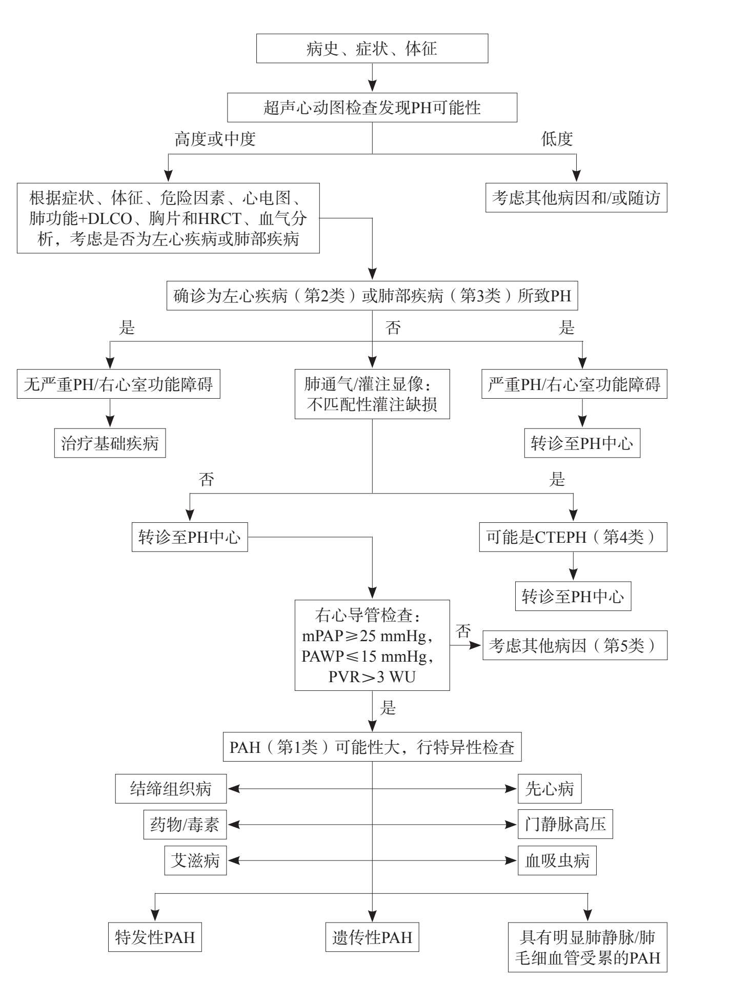 PH起病隐匿,患者一般表现为劳力性呼吸困难、疲劳、心悸、晕厥、胸痛等非特异性症状。随着病情进展,上述症状可在静息时或轻微活动后出现。常见的体征包括第二心音亢进、颈静脉怒张,随着右心室功能下降,可出现下肢水肿、腹胀和腹水。当怀疑存在PH时,需详细采集患者病史并对患者进行体格检查,完善实验室检查、胸片、心电图、超声心动图、胸部计算机体层血管成像(CT angiography,CTA)、心导管等检查,以排除其他原因导致的PH(如左心疾病、肺部疾病、肺动脉阻塞性病变、特发性肺动脉高压等)来明确诊断,如图5所示。