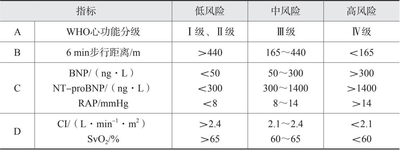 注:BNP为B型利钠肽;NT-proBNP为N末端B型利钠肽前体;RAP为右心房压;CI为心脏指数;SvO 2 为静脉血氧饱和度。低风险,至少符合三项低风险标准且不具有高风险标准;高风险,符合两项高风险标准,其中包括心脏指数或静脉血氧饱和度;中风险,不属于低风险和高风险者均属于中风险。