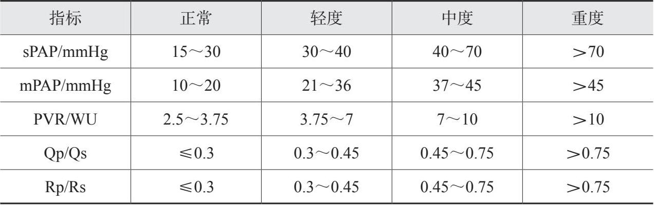 右心导管检查(right heart catheterization,RHC)是确诊PAH CHD的金标准,也是判断患者能否手术治疗和预后的最重要检查方法。其可直接测量心脏各腔室和大血管腔内压力,获取血标本以测量血氧含量,通过计算肺循环血流量与体循环血流量比值(Qp/Qs)、肺血管阻力(PVR)、肺血管阻力与体循环阻力比值(Rp/Rs)等指标来判断PAH严重程度(表7),并衡量手术指征。