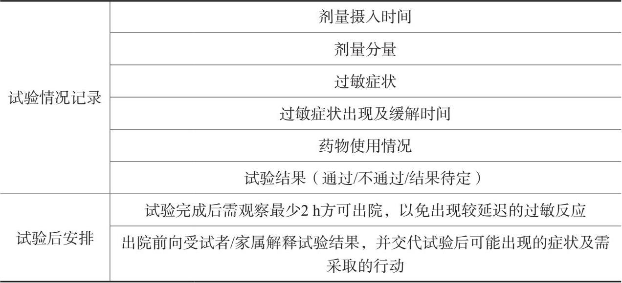 表15概述了分步式OFC的工作流程。在开始OFC之前,应记录患者的基线生命体征,包括呼吸频率、心率和血压,并记录体格检查结果。每摄入一次OFC剂量后,检查患者是否发生了任何过敏反应,并定期监测其生命体征。如果发现任何客观存在的过敏反应,立刻停止OFC,并立即开展治疗以缓解过敏反应。OFC后,患者会被建议留院观察至少2 h。