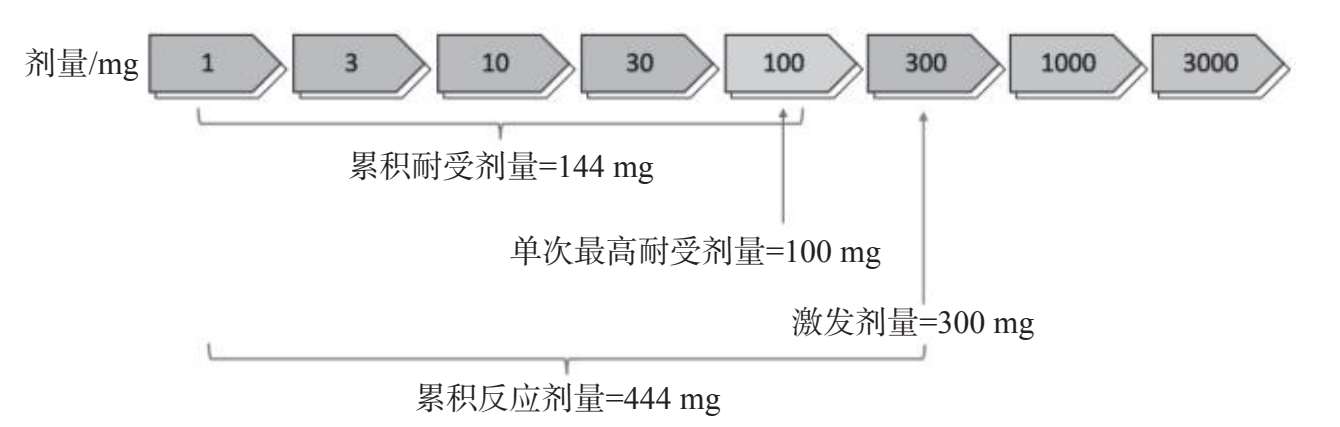 OFC通常是每隔15~30 min增加可疑过敏性食物的剂量。一般情况下OFC剂量逐渐增加,直至发生过敏反应或达到最大标准剂量。如果患者有严重过敏反应史和/或发生反应概率较高,则应将整个OFC提供的食物分成至少6个剂量 [20] 。低毫克的起始剂量通常是安全的 [21] 。与此同时,在临床实践中,对于低风险的OFC,可考虑给予患者较高的起始剂量,但是最少给3或4剂。然而,高起始剂量可能与OFC过程中更严重的过敏反应相关 [22] 。图10提供了OFC的推荐剂量和结果定义 [20] 。