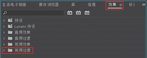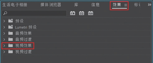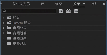 “效果”面板: 面板中包含视频、音频和过渡的各种效果。通过上方的搜索框可以快速查找需要的效果,如图1-2所示。
