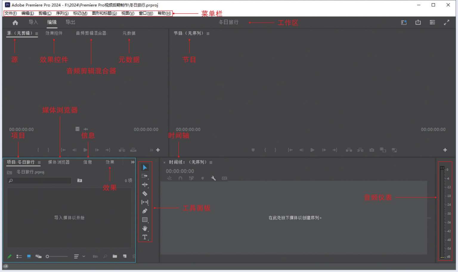 Premiere Pro的编辑界面由多个板块组成,如图1-1所示。下面介绍日常工作中常用的面板。