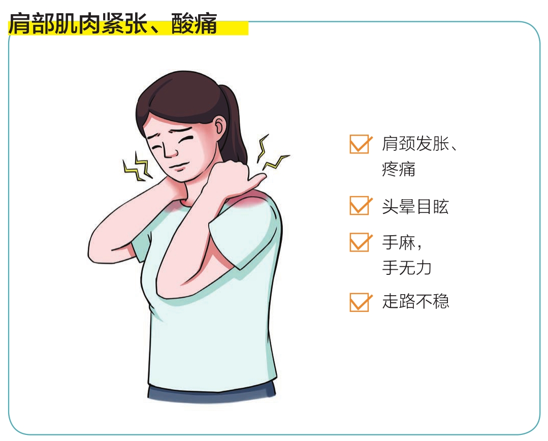 ● 肩颈处有酸酸麻麻的感觉,严重时有针扎的感觉,休息后缓解。
