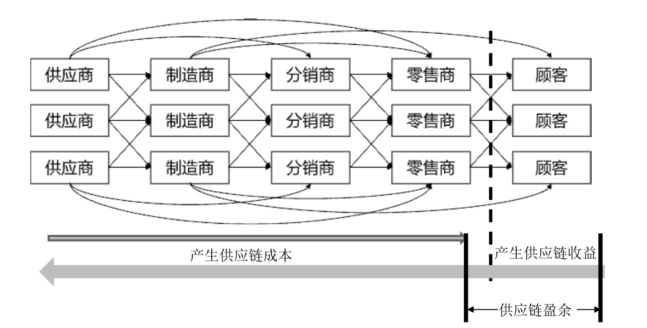 任何一个供应链的主要目的都是在满足顾客需求的过程中为自己创造利润,实现供应链整体价值最大化。那么什么是供应链整体价值呢?我们观察图1-1展现的典型供应链就会发现,除了顾客是供应链的付费者之外,其他供应链参与者都是供应链的供应者,他们都要并只能从顾客支付的费用中分得收益。因此我们在顾客与所有供应者之间画一条虚线,这条虚线左侧的所有供应链活动会产生供应链成本,这条虚线右侧是最终需求者,他们的支付构成了供应链全部收益会产生供应链收益。供应链整体价值就是供应链收益和供应链总成本之间的差额,这个差额又被称为供应链盈余,供应链收益也被称为最终产品对顾客的价值(即顾客价值)。