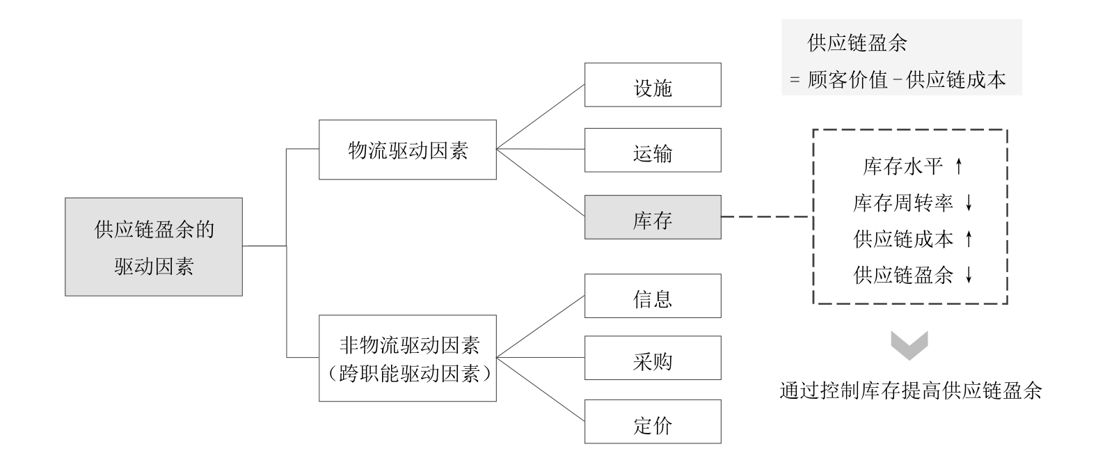 库存属于物流驱动因素,它不仅是实物概念,还是资金概念。从实物角度,库存是生产和仓储过程中的成品、半成品、零部件、原材料;从资金角度,库存是对资金的占用,是企业的存货资产。供应链的库存水平提高,就意味着占用的资金量变大,在每年资金总量一定的条件下,资金周转次数就会减少,可以理解为用了更多的资金满足同样的需求,资金收益率就会降低。因为库存被卖出之前都是成本,被卖出之后才会产生收益,因此库存水平越高,供应链成本就越高,供应链盈余就越低。相反的情况是供应链中的库存不足,顾客的部分需求将不能被满足,供应链就会丧失部分利润,顾客价值减少。因此,将供应链库存控制在合理水平以降低供应链成本是提高供应链盈余的重要途径之一。