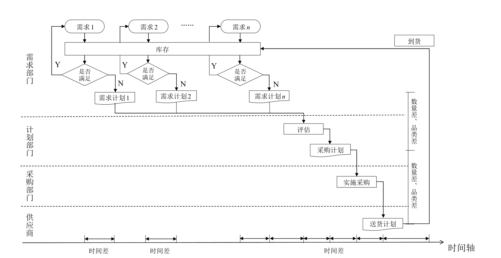 除了供应端和需求端各自的不确定性外,时间差也是供给和需求之间不匹配的重要因素,空间上的不匹配通过运输的跨越也可以转化为时间问题。图1-4展示了需求产生到被满足的过程。当需求产生时,企业首先检查是否有足够的库存满足需求,如果不满足,将形成需求计划;需求计划经过计划部门汇总和评估形成采购计划,由于受到一系列类似于规模经济效应、采购成本、可获得性、预算等因素的影响,此时的采购计划与需求计划并非完全匹配,可能形成数量差和品类差;采购部门实施一系列采购活动,最后由供应商制定送货计划,送货可能是分批次完成的,通过运输活动交付,补充库存,满足需求。受制于流程的实施和货物在空间上的移动必须消耗时间,需求产生与需求被满足之间的时间差无法完全消除。在这段时间差内,如果想要需求仍被满足,就需要持有一定库存。