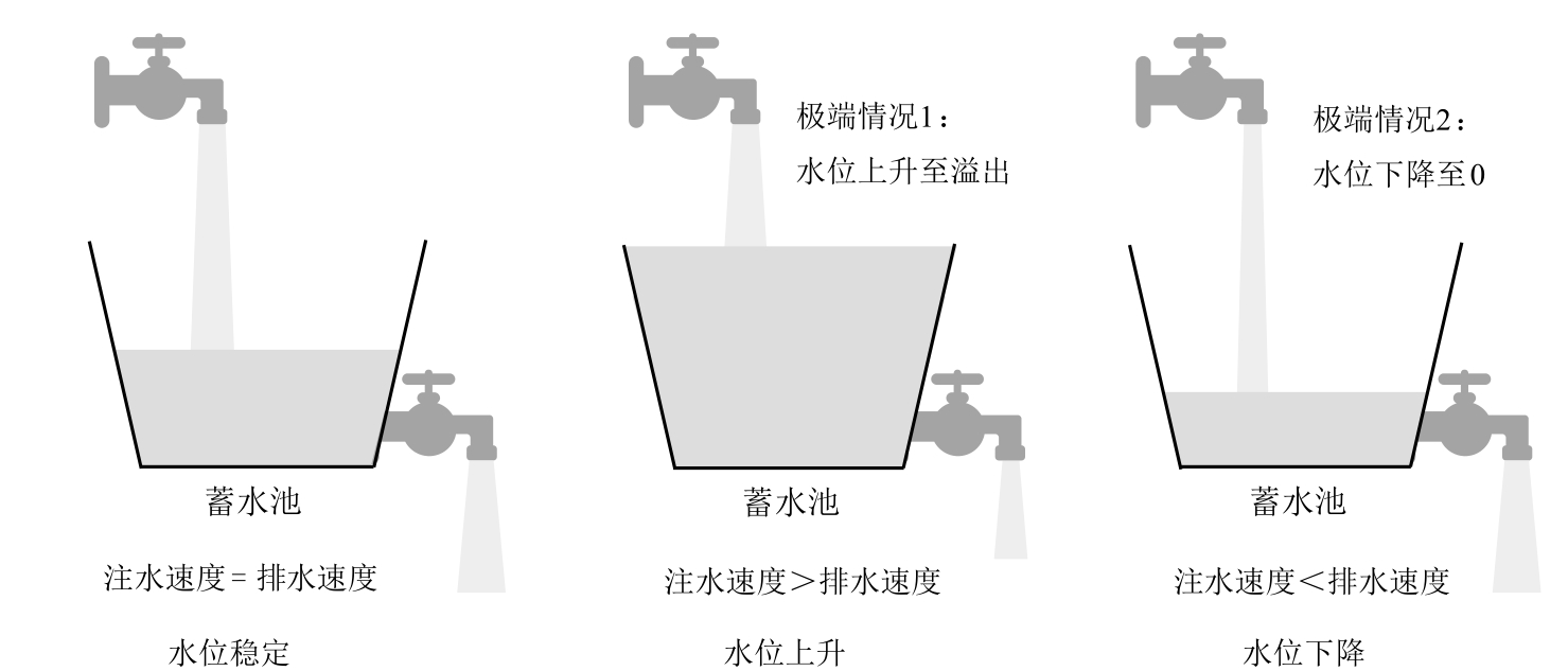 库存形成的原因是供给与需求不匹配。图1-3中的蓄水池水位状态代表库存。当注水速度和排水速度相同时,蓄水池的水位稳定。如果注水速度与排水速度始终相同,那么蓄水池没有必要存在。当注水速度大于排水速度时,水位上升,极端情况下水可能溢出,称为“胀库”。当注水速度小于排水速度时,水位下降,极端情况下水位可能下降至0,称为“缺货”。