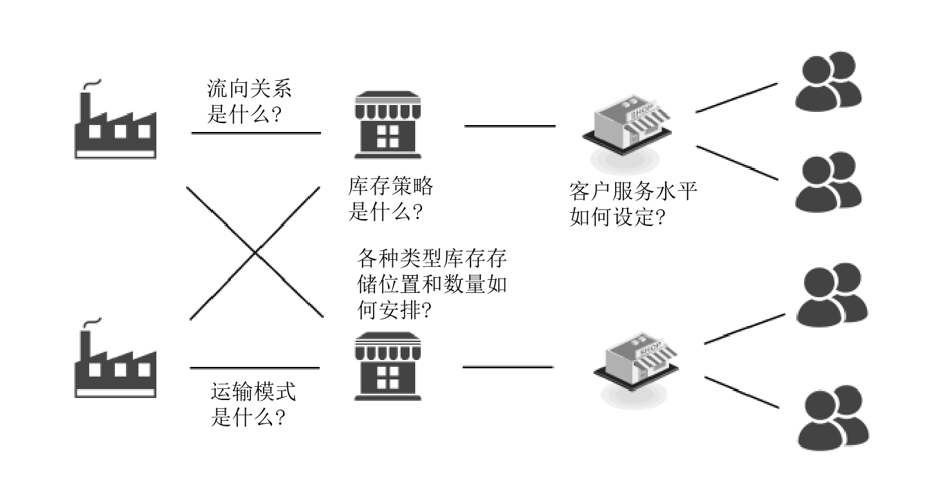 既然库存是因为供需不匹配形成的,那么就需要对供需进行管理,期望尽可能提高供给流和需求流的匹配度,并用合理的供应链库存弥补其中的差距。供应链计划层的库存控制聚焦于通过对供给流和需求流的管理和设计,测算供应链环节中合理的库存分布,对产品流在供应链中的流动和停顿做出安排。供应链库存优化决策的基础是一张供应链网络,而不是单一节点。面对一个多层级的供应链网络,应该把库存放在哪里?是更靠近消费者的配送中心,还是更靠近供应商的分拨中心?每种设施里应该放哪些品类?每种品类放多少合适?供应链中应该存更多的原材料,还是应该存更多的产成品?允许缺货吗?应该保持多少安全库存?供应链计划层需要对诸如此类的问题做出库存优化决策。图1-6展示了供应链计划层库存优化决策的常规问题。