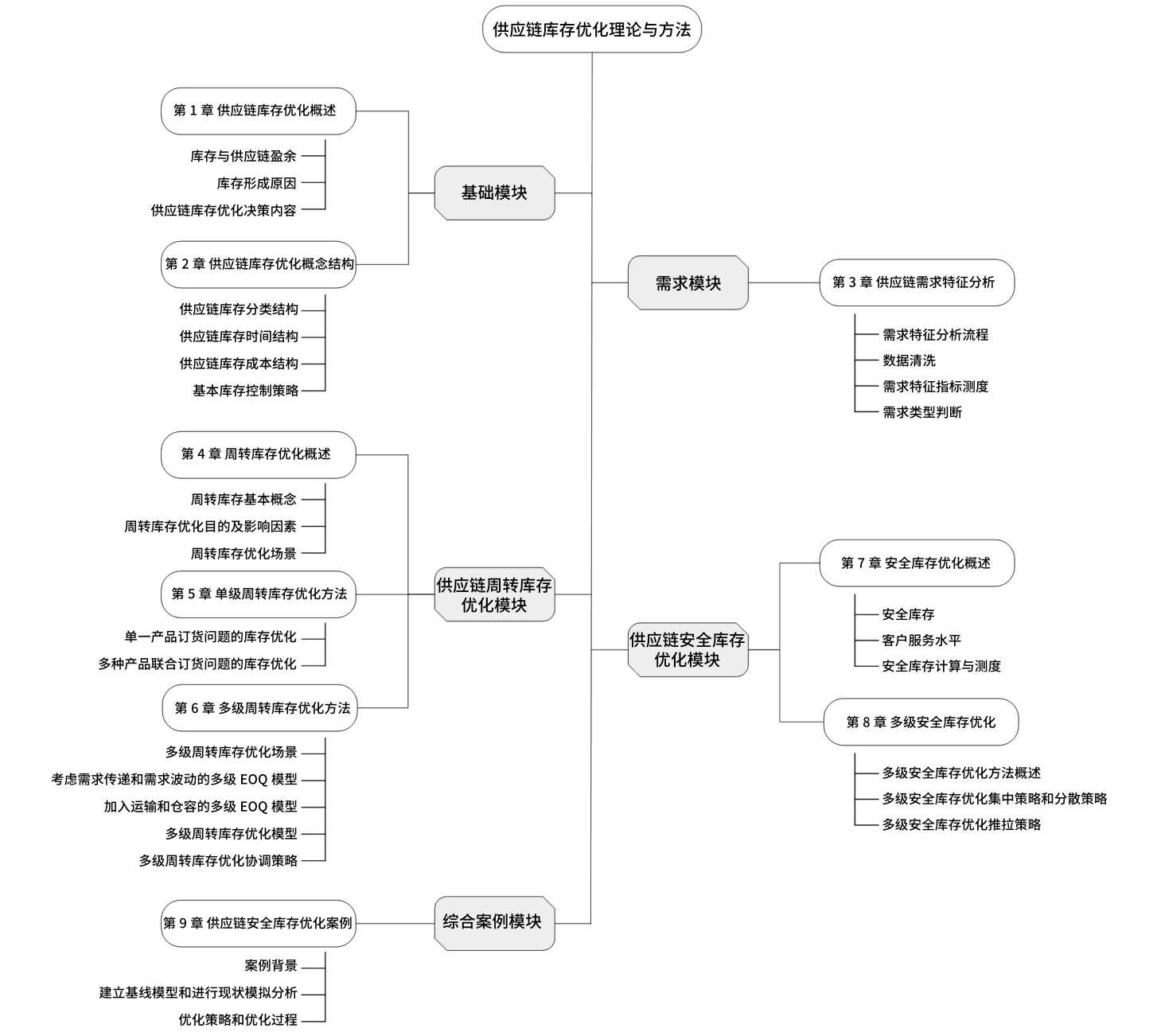 本书分为九章五个模块。前两章是基础模块,主要介绍供应链库存优化的基础知识。第3章是供应链需求模块,主要介绍供应链需求特征分析,该方法用于判断供应链需求类型,为供应链库存优化策略选择提供依据。第4章到第6章是供应链周转库存优化模块。第4章介绍周转库存优化的基本知识,第5章研究单级周转库存优化方法,第6章研究多级周转库存优化方法。第7章和第8章是供应链安全库存优化模块。第7章介绍安全库存优化的基本知识,第8章研究多级安全库存优化。第9章是综合案例模块,介绍了供应链安全库存优化的案例。本书内容结构如图1-7所示。因为本书的内容铺陈具有很强的递进性,建议读者按顺序阅读,便于理解供应链库存优化的整体逻辑。