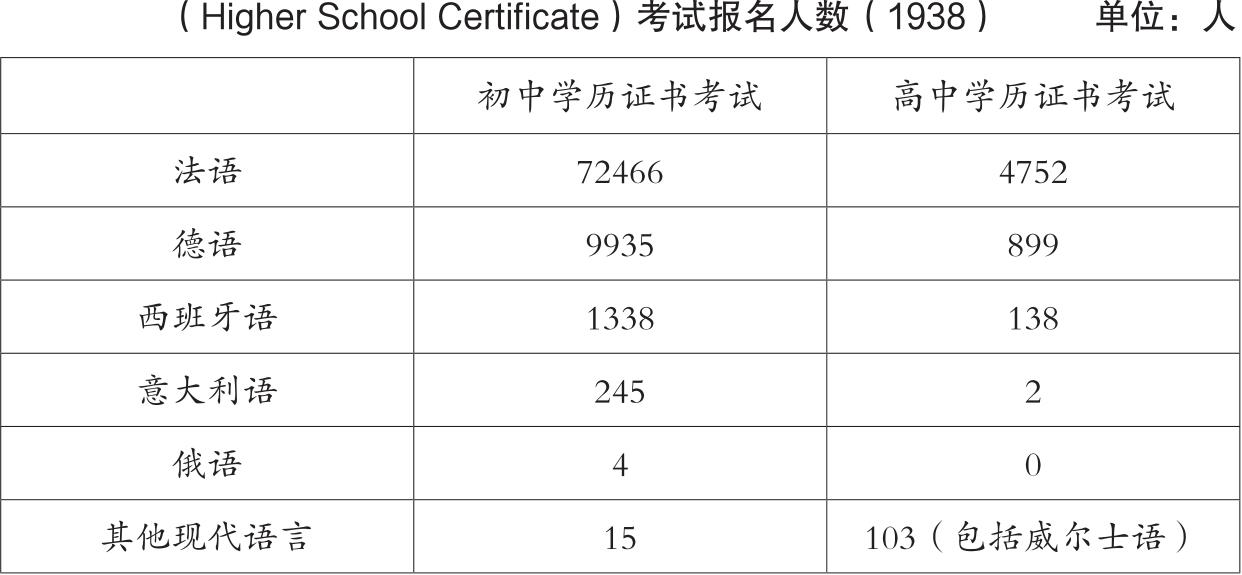 如表1.1所示,在英国初中学历证书(相当于GCSE证书)和高中学历证书(相当于A-Level证书)的公共考试阶段,参加法语考试的学生人数分别约为参加德语考试的学生人数的8倍和4倍。即使是像斯托(Stowe)学校这样的公立学校也只向少数学生教授德语,并且只聘用了一名显然“几乎不懂德语”的德语教师(Ramsden 2007:151)。在这种情况下,即使英国的学龄儿童与欧洲国家的学龄儿童之间存在交流,这种交流也很可能仅限于英法两国之间。因此,现代语言协会(Modern Language Association)推行“笔友计划”(pen friend scheme)后,英国学校与法国学校之间先后建立了共5700多个合作关系,而与德国学校之间只建立了50个。 5 这种在教育资源水平上的巨大差异所造成的后果是显而易见的,既表现为英国在不同外语专业上取得高级证书的人数不平衡,也表现为英国与不同国家进行文化交流时的总体活跃程度不平衡。在20世纪30年代,从英国大学毕业并取得德语单专业本科学位(Single Honours Degree)的学生不到90人。英国移民学者恩斯特·贡布里希(Ernst Gombrich)发现,英国人总体上不太了解德国文化,即使是曾受过高等教育的英国人也是如此:“他们所有人都懂法语,都懂意大利语,也都懂古典语言,就是不懂德语” 6 。实际上,到1922年,意大利语也已经从英国中学教育课程中几乎消失了,俄语也只在少数学校中幸存(Muckle 2008:94)。1920年至1939年间,伦敦大学学院斯拉夫东欧研究院(SSEES)的俄语专业毕业生总数不超过10人。如表1.2所示,在商业性脱产学习班和夜间学习班中,法语课程的报名人数也是最多的。但至少在学习班中,商业需求和个人选择是影响报名情况的重要因素,因此,可以看出德语课程在学习班中比在中学教育中更受欢迎。