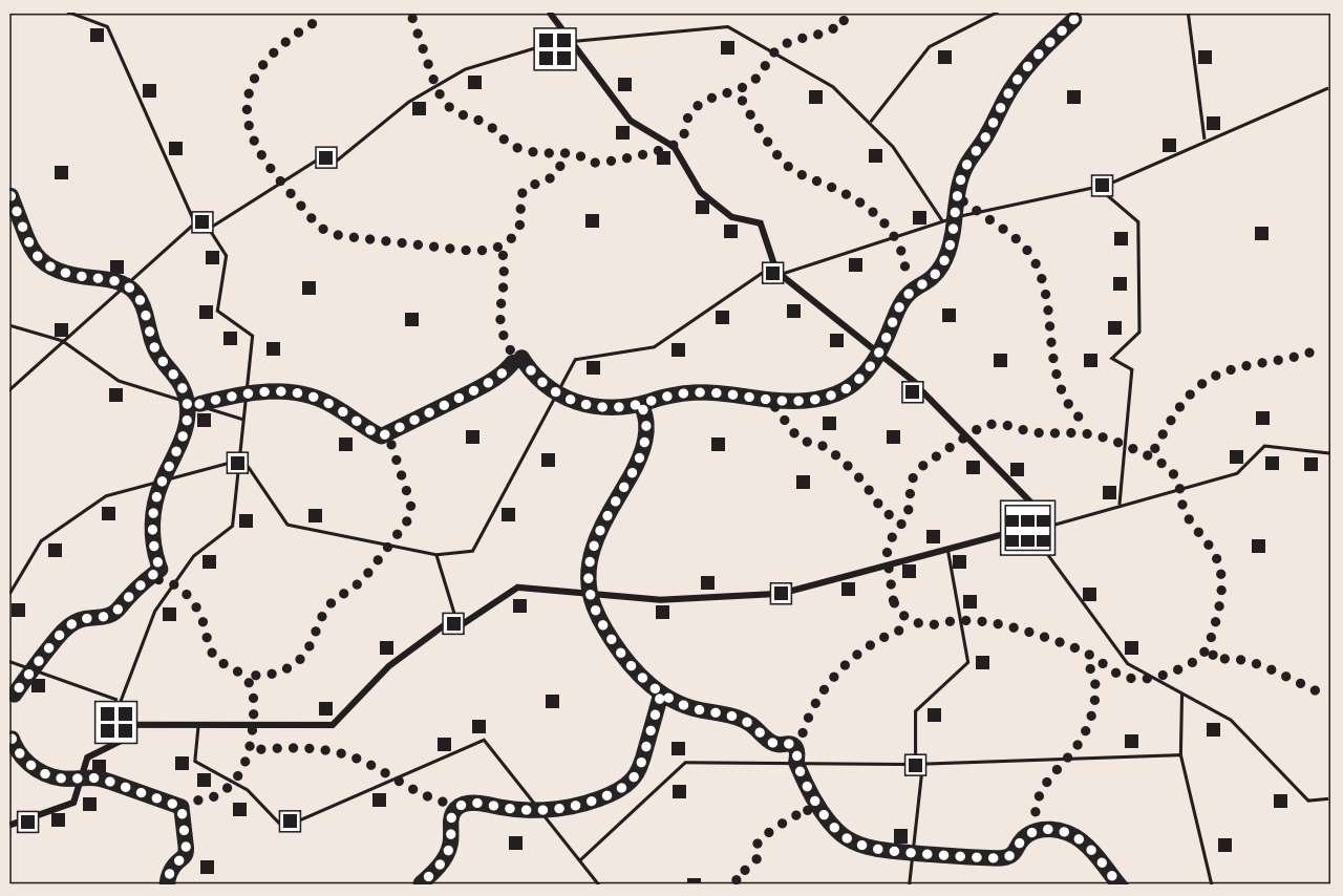 *█为聚落,虚线为乡的边界,白点粗线为县的边界,细线为干道,粗线为主干道,包含聚落的□为乡的治所,包含数个聚落的□为县城,包含数个里的 为郡城。