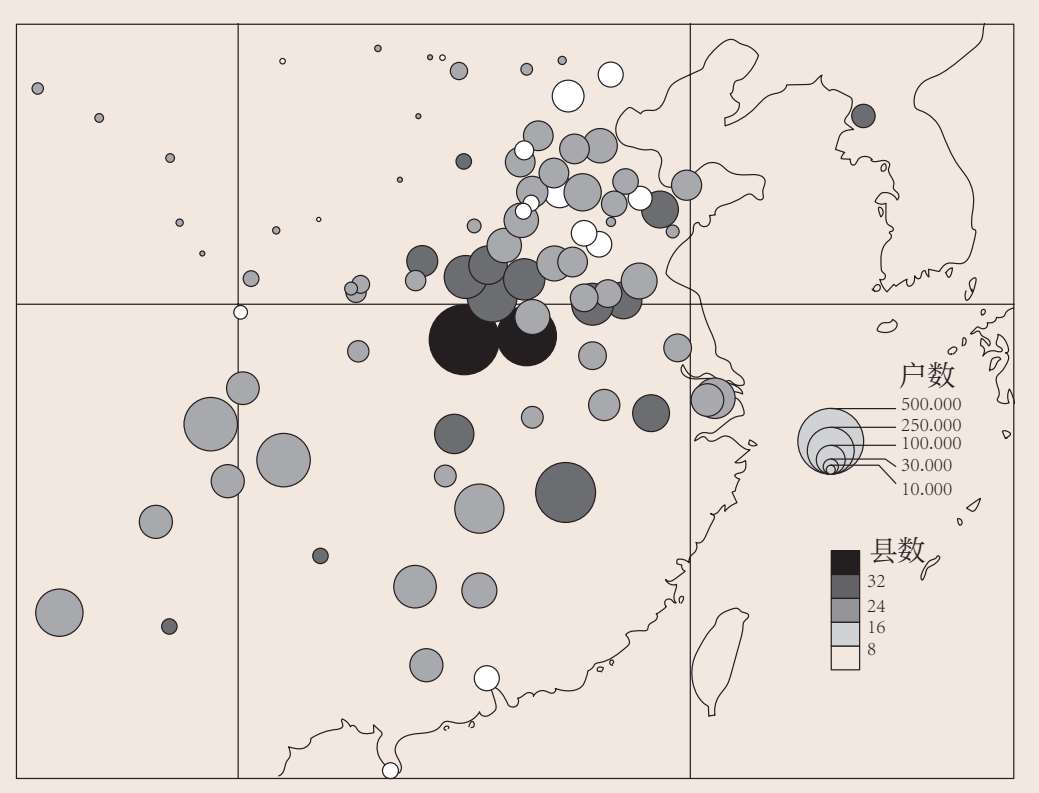 此外,当时中国北方与南方的都市分布存在巨大差异,大部分人口集中在北部,南部人口则相对稀疏(图0-3)。取平均值看,一里所住人口不到一百户,一乡平均一千五百户到两千户,一县平均七千户到一万户。