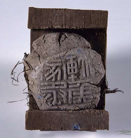 重要的文书会用绳子捆扎,让人无法看到内容。绳结处涂泥,再盖上印章。这里不使用印泥,而是直接将印章按入泥中,让文字浮现在泥上。稍候片刻,待泥干结凝固,文字便会清晰显现。通过印章的痕迹,就能知道文书是谁寄出的。文书一旦开封,泥的部分必会损坏,无法复原。这就是当时的封缄方法,称为封泥(图2-2)。