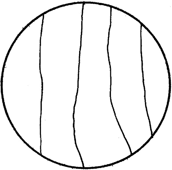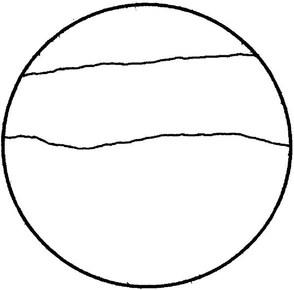 我大吃一惊。怎么会连这么简单的题都不会做呢?只要像奔驰汽车的标志一样画三条线,不就可以把蛋糕三等分了吗?之后我又让他试了几次,他不是像图2-1一样横着切,就是把蛋糕四等分之后才发现还是不对,只能无可奈何地叹气。还有另一个孩子是像图2-2一样切的。我问“那如果有5个人吃蛋糕该怎么办呢?”,他马上像图2-3一样,在蛋糕上画了4条竖线,满脸得意地拿给我看。