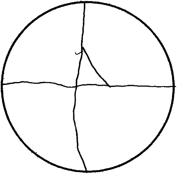 这个脾气暴躁的孩子先画了一条竖线,把蛋糕分成两半,接下来便不知所措了。我想他可能发现自己画错了,于是在纸上重新画了一个圆递给他。结果他又是竖着切成两半,然后再次陷入了冥思苦想。