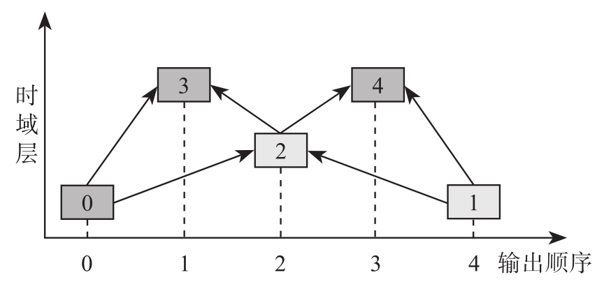 为了提高视频编码效率,视频帧的编码顺序和输出顺序往往是不同的。在实际编码场景中,编码器经常使用金字塔分层预测编码结构 [9] 来提高视频的编码效率。在金字塔分层预测编码结构中,图片组(Group Of Picture,GOP)中的每个图片被分为不同的时域层(Temporal Layer),高时域层的视频帧通常以低时域层的视频帧作为参考帧。在编码过程中,编码器通常使用相对较低的量化步长来编码低时域层的视频帧,以优化整个GOP的率失真性能。这种编码结构可以提高视频编码效率,并在不同的网络带宽下提供适当的视频质量。图2-1所示为GOP长度等于4帧的金字塔预测编码结构中的编码顺序和输出顺序,其中每个矩形框表示一个视频帧,矩形框中的数字表示该帧的编码顺序;下方的横轴表示时间轴,对应的数字是每个视频帧的输出顺序。带有箭头的直线表示参考关系,该直线从参考帧指向编码帧,比如帧3的参考帧包括帧0和帧2。