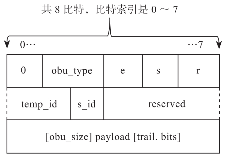在图2-2中,0表示obu_forbidden_bit;e、s和r分别表示obu_extension_flag、obu_has_size_field和obu_reserved_1bit;temp_id表示语法元素temporal_id,占用3比特;s_id表示语法元素spatial_id,占用2比特;reserved表示语法元素extension_header_reserved_3bits,占用3比特;obu_size表示以字节为单位指定OBU的大小,但是不包括obu_header中的字节或obu_size语法元素中的字节,它是可选的,即OBU不需要必须包含obu_size;trail、bits包括语法元素trailing_one_bit和trailing_zero_bit。