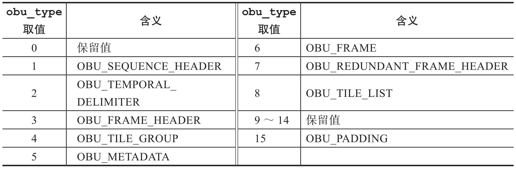 根据obu_type的取值,OBU可以分为序列头部OBU(OBU_SEQUENCE_HEADER)、帧头部OBU(OBU_FRAME_HEADER)、元数据信息OBU(OBU_METADATA)、时间分隔符OBU(OBU_TEMPORAL_DELIMITER)和切片组OBU(OBU_TILE_GROUP)。