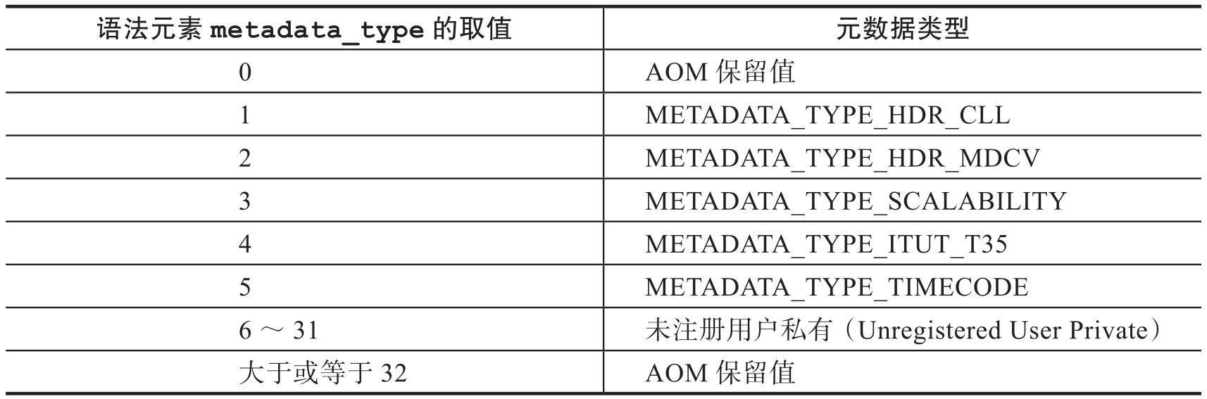 元数据信息OBU的作用是传输视频编码过程中的元数据信息。元数据包括色彩空间信息、高动态范围(High Dynamic Range,HDR)信息、可扩展性编码信息以及时间信息。为了区分元数据中的信息,AV1定义了语法元素metadata_type,以指明元数据存储的数据类型。表2-3所示为metadata_type的取值及元数据类型。