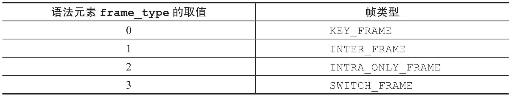 帧头信息中的语法元素frame_type用于指明视频图片的帧类型。AV1定义了4种帧类型:KEY_FRAME、INTER_FRAME、INTRA_ONLY_FRAME和SWITCH_FRAME。表2-2所示为frame_type的取值及帧类型。